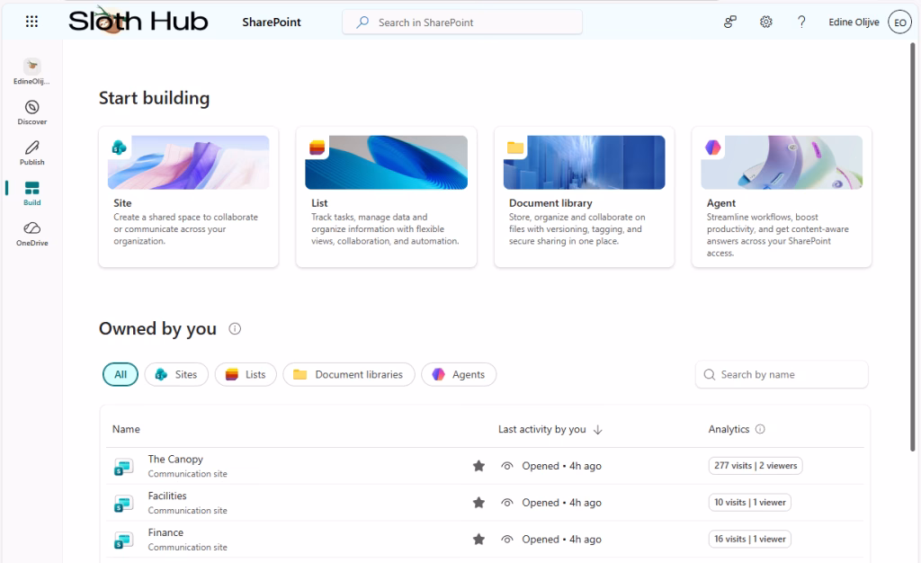 Last on our list of new tabs is the Build tab. This is your new home for creating sites, document libraries, lists, and agents. While sites and lists haven’t changed much lately, having a single overview of everything you own is a nice touch. One thing to note: the overview of document libraries only shows the ones you created yourself. It doesn’t include the standard “Documents”, “Site Pages” etc libraries that comes with every site.